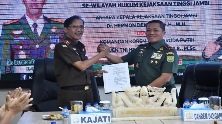 Pihak Kejati Jambi berkolaborasi dengan Danrem 042/GAPU dengan melakukan Penandatanganan Berita Acara Pengamanan Kantor Kejaksaan Tinggi Jambi, Kejaksaan Negeri dan Cabang Kejaksaan Negeri se-Wilayah Hukum Kejaksaan Tinggi Jambi oleh personel TNI bertempat di Kantor Kejaksaan Tinggi Jambi, pada Kamis (22/05/2025).