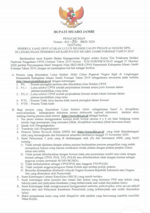 MUARO JAMBI – Berdasarkan ketentuan dan jadwal yang telah ditetapkan oleh Badan Kepegawaian Negara (BKN), Pemerintah Kabupaten Muaro Jambi menindaklanjutinya dengan mengeluarkan hasil kelulusan penerimaan CPNS tahun 2020.