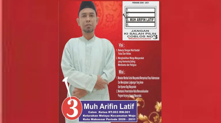 MAKASSAR, Beritategas.com — Muh. Arifin Latif resmi menyatakan diri maju sebagai kandidat Ketua RT 003 Kelurahan Melayu, Kecamatan Wajo. Dalam pernyataannya, Pipink demikian panggilan akrabnya, menegaskan bahwa keikutsertaannya dalam kontestasi tingkat Rukun Tetangga ini lahir dari dorongan kuat untuk menghadirkan pelayanan yang lebih baik, responsif, dan terbuka kepada seluruh warga.