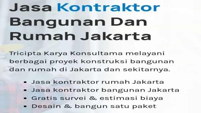 Jasa kontraktor Jakarta profesional memastikan bangunan aman kokoh hemat biaya mematuhi standar. Pahami proses, estimasi harga sekitar Rp4-6 juta/m2, hindari kesalahan pemilihan untuk hasil prima. Hubungi mitra berpengalaman sekarang, wujudkan proyek impian mulus.(Ads)