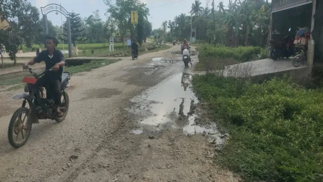 Jalan yang seharusnya menjadi akses utama masyarakat justru berubah menjadi “jalur maut”. Lubang menganga, permukaan aspal yang rusak berat, hingga genangan air membuat pengendara setiap saat berada dalam ancaman kecelakaan.