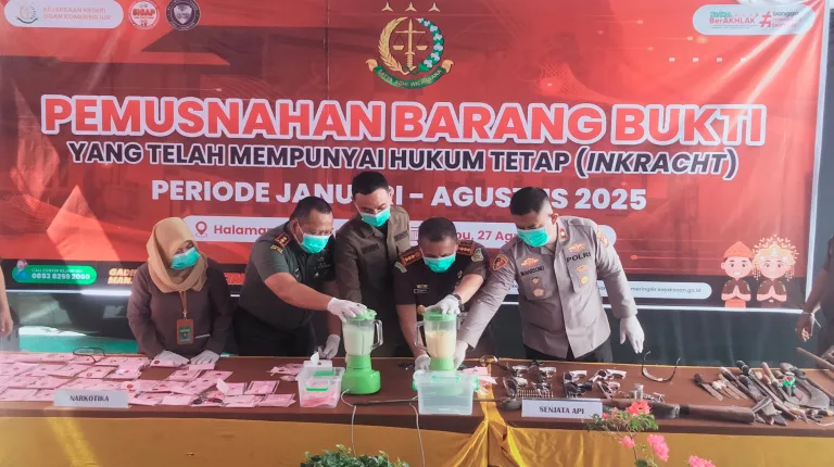 OGAN KOMERING ILIR, Beritategas.com – Kejaksaan Negeri (Kejari) Kabupaten Ogan Komering Ilir (OKI) Gelar kegiatan Pemusnahan Barang Bukti yang telah mempunyai Hukum tetap (Inkracht) untuk Periode Januari-Agustus 2025, berlangsung di Halaman Kantor Kejari OKI, Kayuagung, Rabu (27/8).