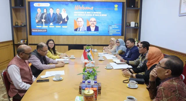 JAMBI, Beritategas.com – Rektor Universitas Jambi, Prof. Helmi, bersama Wakil Rektor Bidang Akademik, Prof. Dr. Hafrida, S.H., M.H., Wakil Rektor Bidang Perencanaan, Keuangan dan Umum, Prof. Dr. Ir. Depison, M.P, Wakil Rektor Bidang Kerjasama, Hubungan Masyarakat dan Sistem Informasi, Prof. Dr. Revis Asra, S.Si., M.Si, beserta undangan lainnya menyambut kedatangan Duta Besar India Untuk Indonesia, H.E. Sandeep Chakravorty dan Consulate General of India in Medan, H.E. Ravi Shanker Goel beserta rombongan di Gedung Rektorat UNJA Mendalo pada Rabu (18/12/2024).