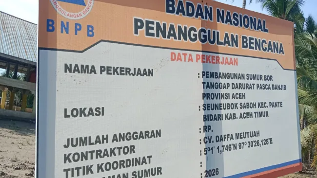 ACEH TIMUR, Berittegas.com — Tim investigasi media yang tergabung dalam Aliansi Pers Kawal Rehab Rekon Pasca Banjir Aceh menemukan sejumlah dugaan kejanggalan dalam pelaksanaan proyek sumur bor yang bersumber dari anggaran Badan Nasional Penanggulangan Bencana (BNPB) di beberapa lokasi di Kabupaten Aceh Timur.
