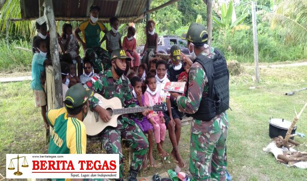 JAYA PURA – Satgas Pamtas RI-PNG Yonif Mekanis Raider (MR) 413 Kostrad Pos Mosso mengajak anak-anak di Kampung Mosso Distrik Muara Tami Kota Jayapura untuk belajar dan bernyanyi bersama dengan tetap memperhatikan protokol kesehatan.