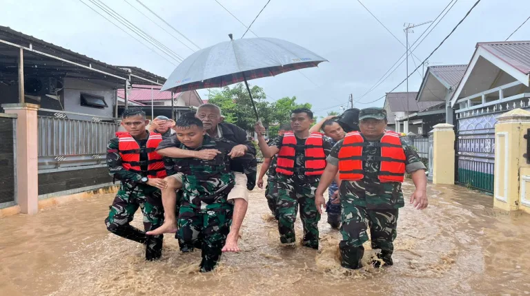 PADANG, Beritategas.com – TNI kembali menunjukkan kesiapsiagaan dalam membantu masyarakat dengan mengerahkan prajurit Lanud Sutan Sjahrir untuk mengevakuasi warga terdampak banjir di Kelurahan Bungo Pasang dan Aia Pacah, Kecamatan Koto Tangah, Kota Padang, Kamis (27/11/2025). Hujan deras yang terjadi sejak pagi memicu naiknya debit air pada kawasan pemukiman.