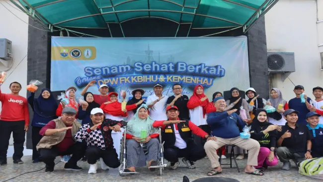 JAMBI, Beritategas.com – Dewan Pengurus Wilayah Perkumpulan Forum Komunikasi Kelompok Bimbingan Ibadah Haji dan Umrah (DPW FK KBIHU) bersama Kementerian Haji dan Umrah (KEMENHAJ) Provinsi Jambi, berkolaborasi dengan Guru Besar bidang Ilmu Olahraga dan Kesehatan Universitas Jambi (UNJA) menggelar kegiatan “Senam Sehat Berkah” bagi calon jemaah haji Provinsi Jambi tahun 2026. Kegiatan ini berlangsung di Asrama Haji Provinsi Jambi, Minggu (26/4/2026).