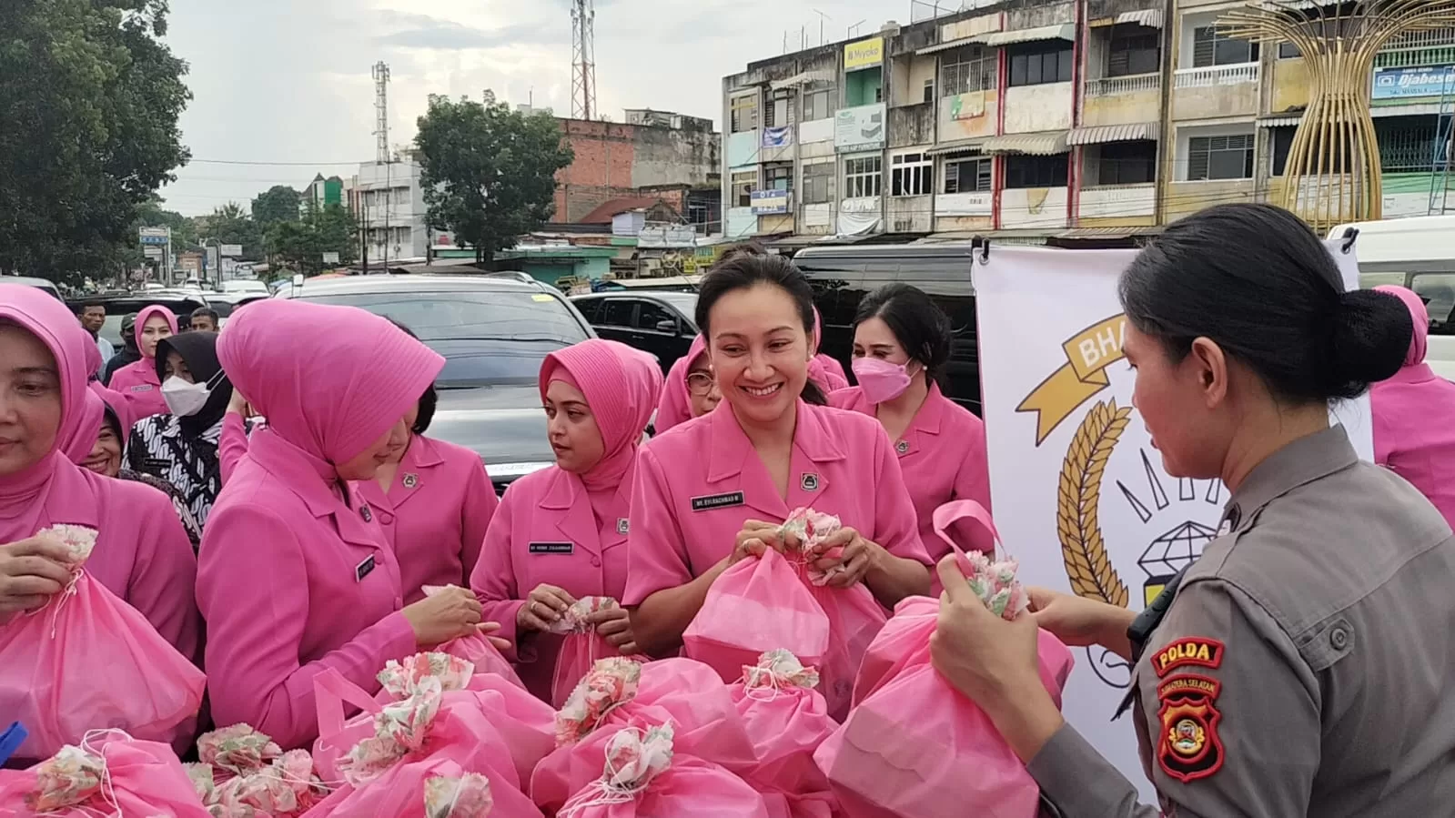 PALEMBANG, Beritategas.com – Ketua PD Bhayangkari Evi Rachmad Wibowo didampingi Wakil Ketua PD Bhayangkari Sumsel Monica M. Zulkarnain bersama Staff PD Bhayangkari Sumsel dan jajaran Pengurus, serta dibantu Polwan dan Personil Polsekta Ilir Timur II dan Bhayangkari Polrestabes Palembang, melakukan aksi mulia dengan berbagi takjil berbuka puasa gratis serta paket sembako kepada para pedagang kaki lima, tukang becak, pengendara motor di seputaran persimpangan Pasar Lemabang di jalan Rama Kasih Raya Duku, Kecamatan Ilir Timur II, Palembang, Kamis sore (04/04/24).