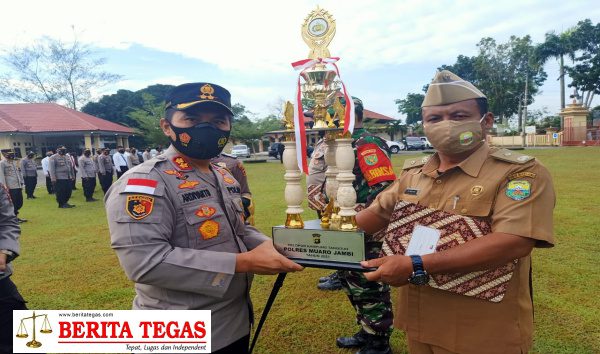 MUARO JAMBI – Kapolres Muaro jambi, AKBP. Ardiyanto, S.IK, M.H memberikan Reward BKTM, babinsa dan kades. Penyerahan penghargaan bertempat di lapangan Mapolres Muaro Jambi, Senin (8/3/2021) pagi.
