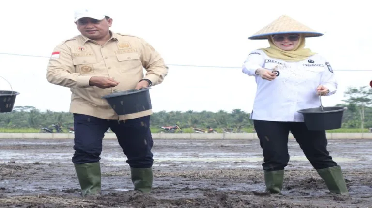 BANYUASIN, Beritategas.com — Bupati Banyuasin, Dr. H. Askolani, SH., MH dan Wakil Bupati Banyuasin, Netta Indian, SP bersama Kapolres Banyuasin, AKBP. Ruri Prastowo SH SIK MIK melakukan Tabur Benih IP 300 perdana di Kabupaten Banyuasin di Desa Mekar Sari Kecamatan Karang Agung Ilir, Jumat (25/07/2025).