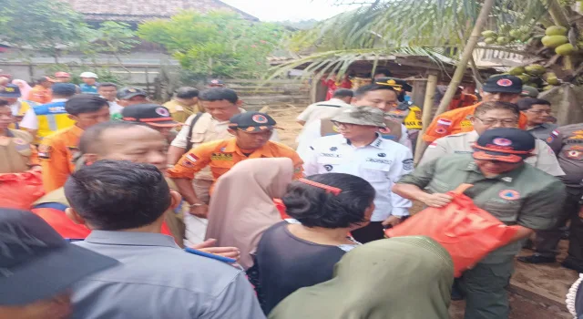 Selesai meninjau jalan akses desa kelumpang dan rumah warga, kepala BNPB pusat dan Forkompinda kabupaten OKU membagikan bantuan berupa bahan pangan.