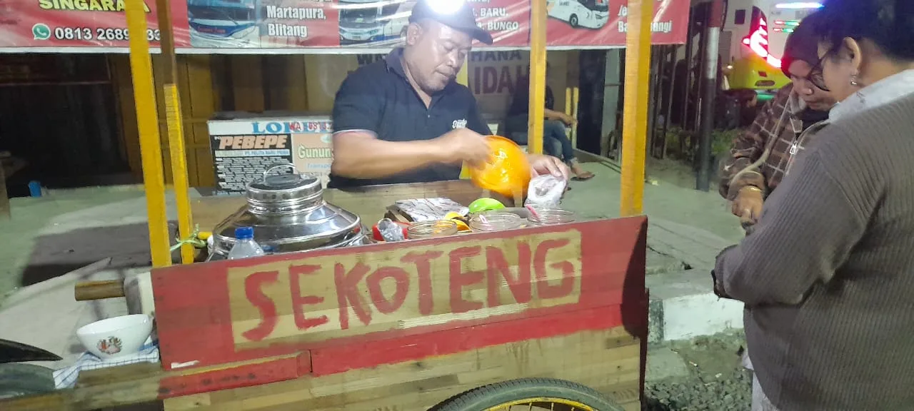 “Sekoteng adalah kuliner yang dapat menghangatkan badan. Kuliner ini terdiri dari roti tawar, kolang kaling, kacang, jahe dan sebagainya. Walau dibandrol dengan Rp. 8.000 saja, Kuliner ini Kuliner yang murah namun bukan murahan”, tuturnya.