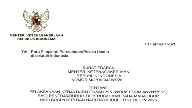JAKARTA, Beritategas.com – Pemerintah melalui Menteri Ketenagakerjaan (Menaker) menerbitkan Surat Edaran Menteri Ketenagakerjaan Republik Indonesia Nomor M/2/HK.04/II/2026 tentang Pelaksanaan Kerja dari Lokasi Lain (Work From Anywhere) bagi Pekerja/Buruh di Perusahaan pada Masa Libur Hari Suci Nyepi dan Hari Raya Idulfitri Tahun 2026.