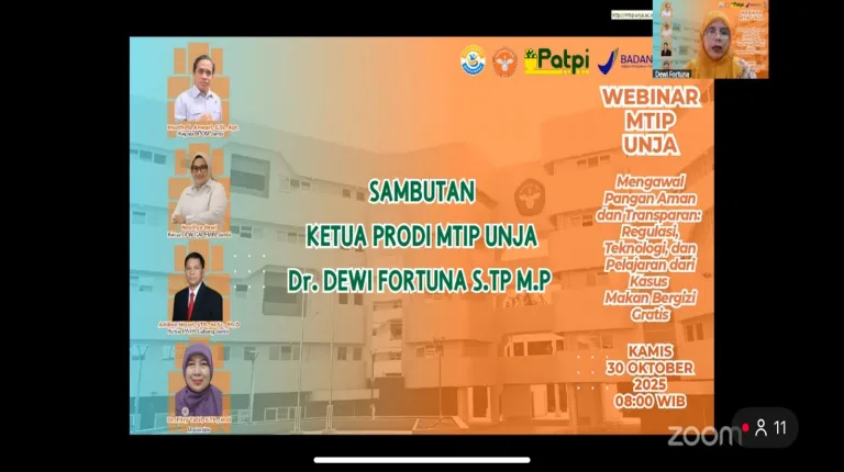JAMBI, Beritategas.com – Magister Teknologi Industri Pertanian (MTIP) Universitas Jambi (UNJA) bekerja sama dengan Balai Pengawas Obat dan Makanan (BPOM) Provinsi Jambi, Perhimpunan Ahli Teknologi Pangan Indonesia (PATPI) cabang Jambi, dan Gabungan Pengusaha Makan Bergizi Indonesia (GAPEMBI) menyelenggarakan Workshop dengan tema “Mengawal Pangan Aman dan Transparan: Regulasi, Teknologi, dan Pembelajaran dari Kasus Makan Bergizi Gratis”. Kegiatan ini terlaksana melalui Via Zoom pada Kamis, 30 Oktober2025, tutur Ilham Wahyudi Senin (03/11/2025).
