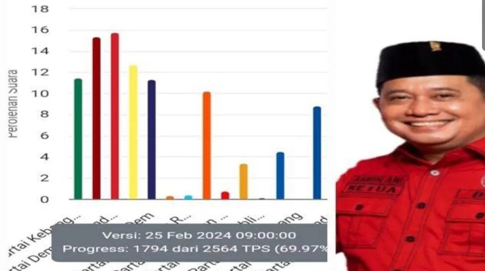 Berdasarkan real count website pemilu2024.kpu.go.id, pada Minggu (25/02) pukul 09.00 WIB, Partai PDI Perjuangan berhasil menempati posisi teratas dengan perolehan suara sementara sebanyak 51.542 atau sekitar 15.81 persen dari 69.97 persen suara masuk atau sebanyak 1.794 TPS dari total TPS 2.564.