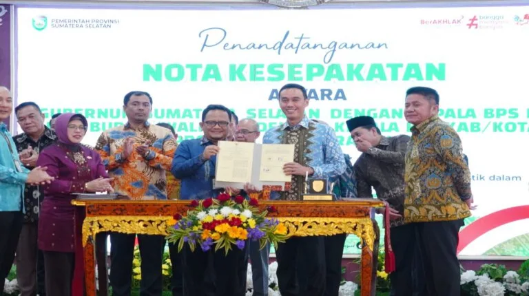 PALEMBANG, Beritategas.com – Pemerintah Kabupaten Ogan Komering Ilir (OKI) bersama dengan seluruh Kabupaten/Kota Se-Sumatera Selatan resmi menandatangani nota kesepahaman (MoU) dengan Badan Pusat Statistik (BPS) di Griya Agung Palembang, Jumat (12/9/2025). Penandatanganan ini menjadi langkah strategis untuk memperkuat tata kelola pembangunan berbasis data yang akurat dan mutakhir.