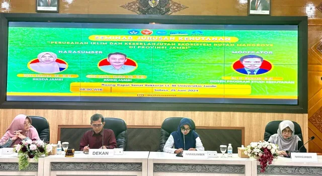 JAMBI, Beritategas.com – Jurusan Kehutanan Fakultas Pertanian (FAPERTA) Universitas Jambi (UNJA) melaksanakan seminar mengangkat tema tentang ‘Perubahan Iklim dan Keberlanjutan Ekosistem Hutan Mangrove’. Seminar tersebut sudah merupakan agenda rutin FAPERTA tiap tahunnya. Seminar dilaksanakan di Ruang Rapat Senat Gedung Rektorat UNJA Mendalo pada Selasa (25/06/2024).