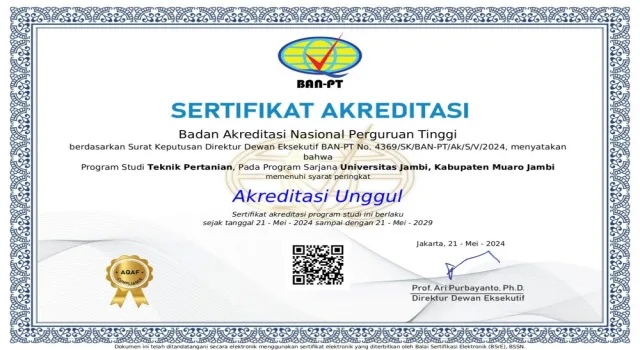 JAMBI, Beritategas.com – Program Studi Teknik Pertanian (TEP) Fakultas Pertanian (FAPERTA) Universitas Jambi (UNJA), berhasil meraih akreditasi ‘Unggul’ dari Lembaga Akreditasi Mandiri Kependidikan (LAMDIK) sesuai dengan SK Direktur Dewan Eksekutif Badan Akreditas Nasional Perguruan Tinggi (BAN-PT ) nomor 4369/SK/BAN-PT/Ak/S/V/2024 tanggal 21 Mei 2024, berlaku mulai tanggal 21 Mei 2024 hingga 21 Mei 2029.