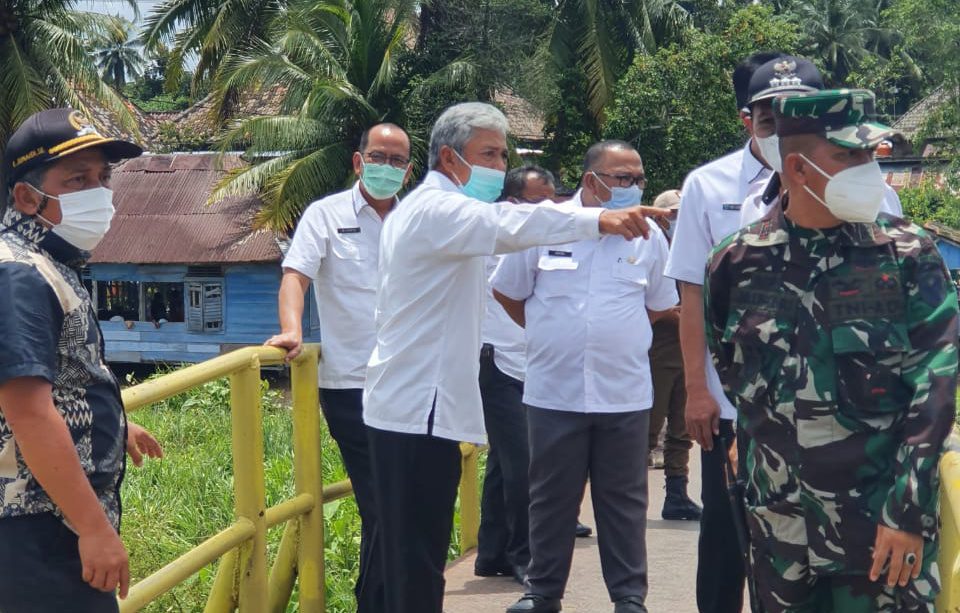 KAYU AGUNG- Bupati Ogan Komering Ilir (OKI), H. Iskandar, SE meninjau langsung jembatan yang putus akibat diterjang arus deras Sungai Komering di Desa Serigeni Kecamatan Kayuagung, OKI pada Kamis, (25/3/2021) siang.