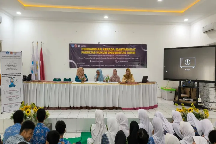 Maraknya praktik judi online yang kini menyusup lewat game-game digital tak dapat kita pungkiri. Menyadari pentingnya literasi digital sejak dini, Dosen Fakultas Hukum Universitas Jambi (FH UNJA) menggelar kegiatan Pengabdian Kepada Masyarakat (PPM) di SMA Negeri 4 Kota Jambi, Provinsi Jambi dengan tema “Pemberdayaan Komunitas Sekolah dalam Pencegahan Penyalahgunaan Game Online yang Mengandung Unsur Judi” pada Kamis (21/08/2025).