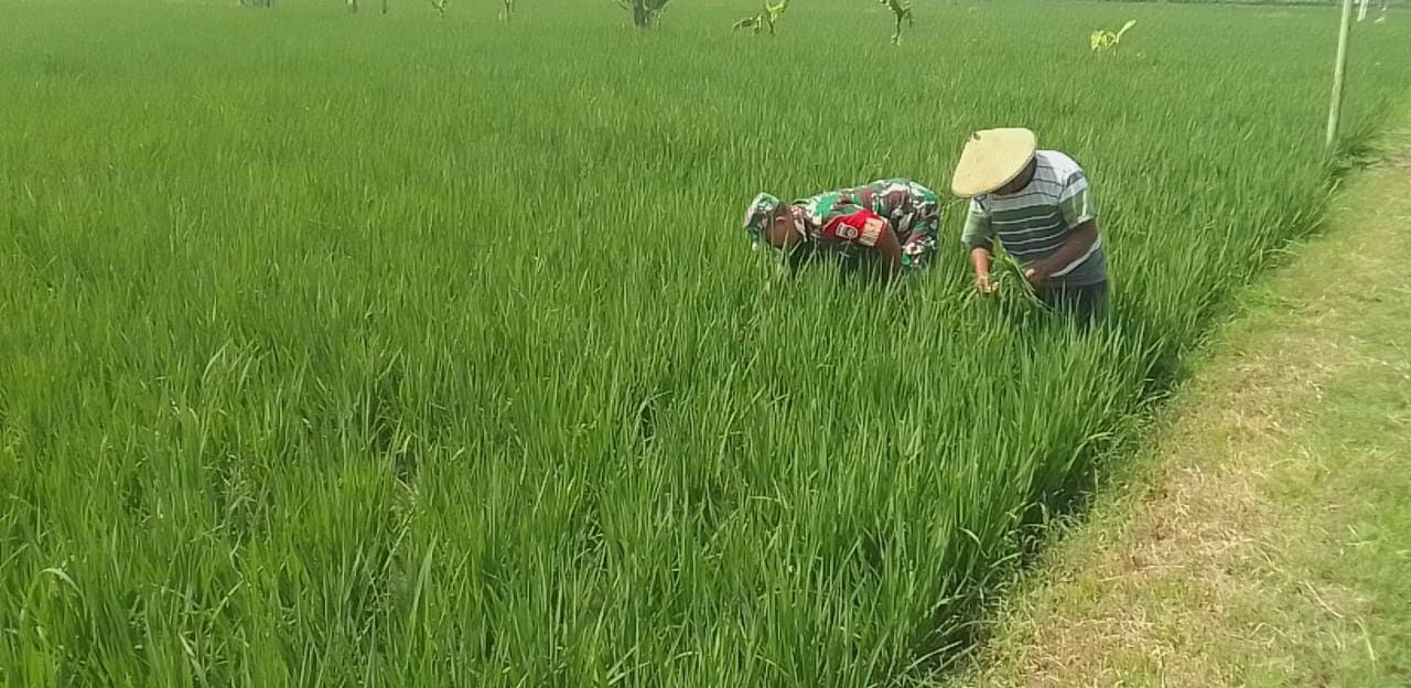 “Rumput di sekeliling tanaman padi jika dibiarkan akan mengganggu kesuburan padi, bahkan lama kelamaan rumput akan menutupi tanaman padi. Pada akhirnya akan membuat padi menjadi kurang sehat dan bahkan bisa mati. Untuk itulah diperlukan proses penyiangan rumput agar tanaman padi bisa tumbuh subur”, jelas Babinsa.