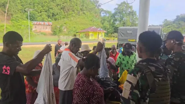 Kehadiran para prajurit disambut dengan antusias oleh warga, mulai dari anak-anak hingga orang dewasa. Satu per satu pakaian dibagikan secara langsung oleh personel Satgas di tengah pemukiman warga.